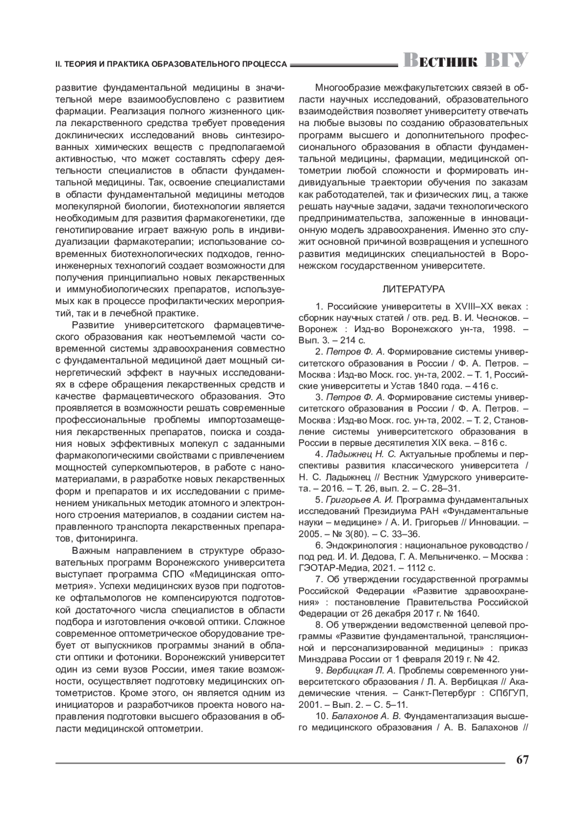 10. Балахонов А. В. Фундаментализация высшего медицинского образования / А. В. Балахонов // Вестник Санкт-Петербургского университета. Сер. 11, Медицина. - 2006. - Вып. 1. - С. 136-141. EDN: PZNYUZ