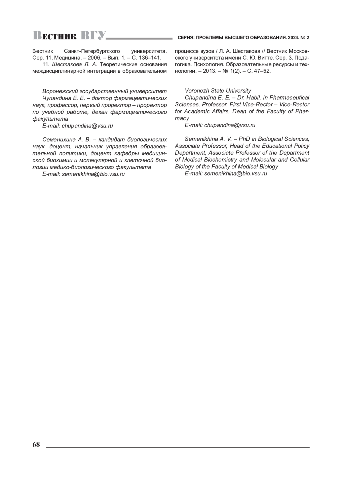 11. Шестакова Л. А. Теоретические основания междисциплинарной интеграции в образовательном процессе вузов / Л. А. Шестакова // Вестник Московского университета имени С. Ю. Витте. Сер. 3, Педагогика. Психология. Образовательные ресурсы и технологии. - 2013. - № 1(2). - С. 47-52.