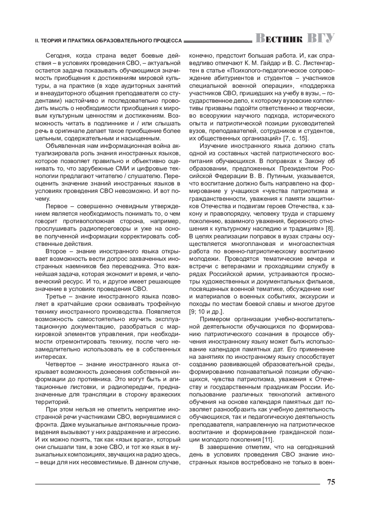 7. Гайдар К. М. Психолого-педагогическое сопровождение абитуриентов и студентов - участников специальной военной операции / К. М. Гайдар, В. С. Листенгартен // Вестник Воронежского государственного университета. Сер.: Проблемы высшего образования. - 2023. - № 3. - С. 10-16. EDN: MARVYE