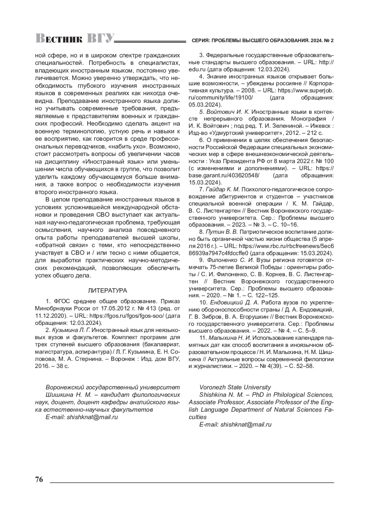 10. Ендовицкий Д. А. Работа вузов по укреплению обороноспособности страны / Д. А. Ендовицкий, Г. В. Зибров, В. А. Егорушкин // Вестник Воронежского государственного университета. Сер.: Проблемы высшего образования. - 2022. - № 4. - С. 5-9. EDN: SQLTMP