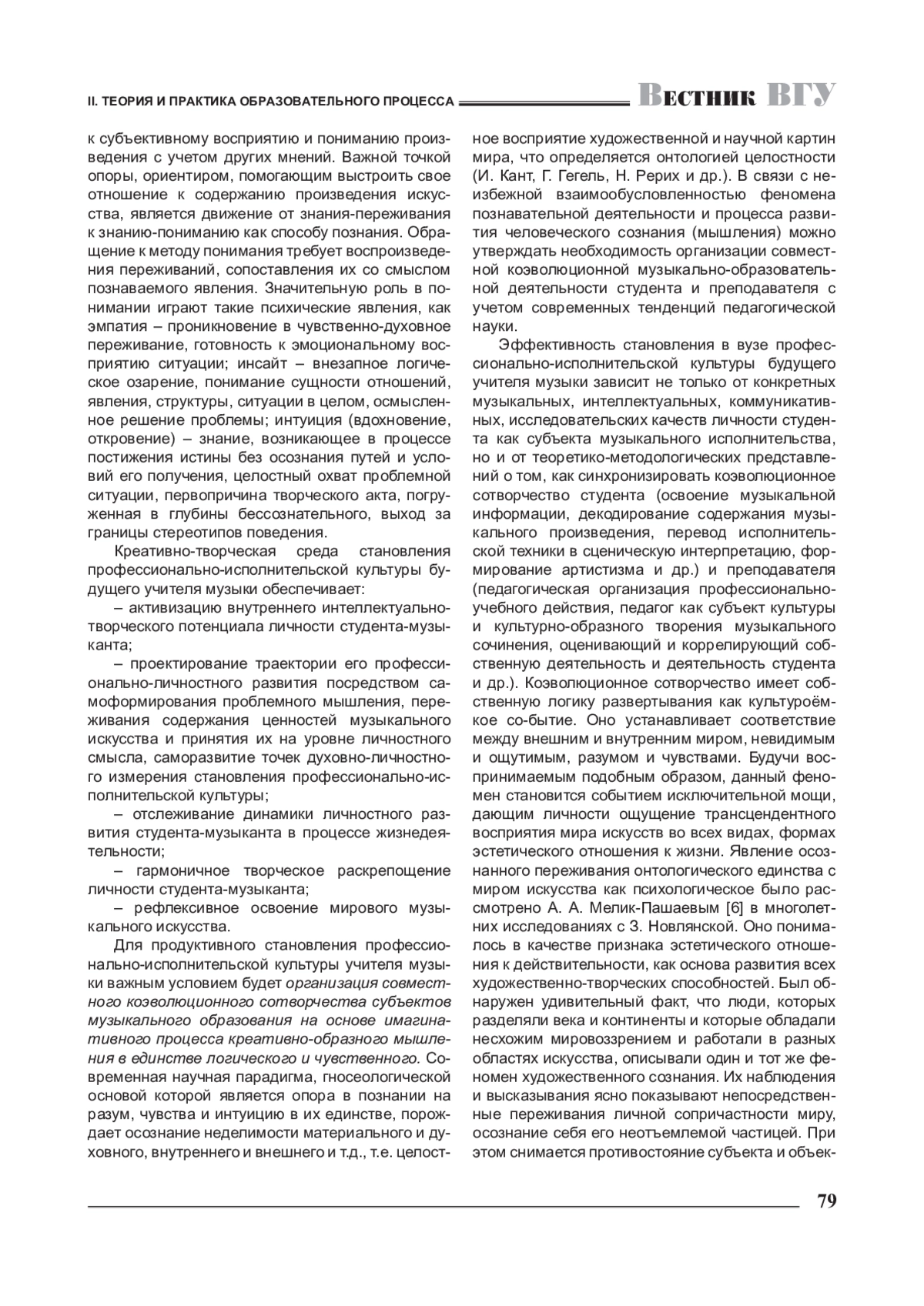 Эффективность становления в вузе профессионально-исполнительской культуры будущего учителя музыки зависит не только от конкретных музыкальных, интеллектуальных, коммуникативных, исследовательских качеств личности студента как субъекта музыкального исполнительства, но и от теоретико-методологических представлений о том, как синхронизировать коэволюционное сотворчество студента (освоение музыкальной информации, декодирование содержания музыкального произведения, перевод исполнительской техники в сценическую интерпретацию, формирование артистизма и др.) и преподавателя (педагогическая организация профессионально-учебного действия, педагог как субъект культуры и культурно-образного творения музыкального сочинения, оценивающий и коррелирующий собственную деятельность и деятельность студента и др.).