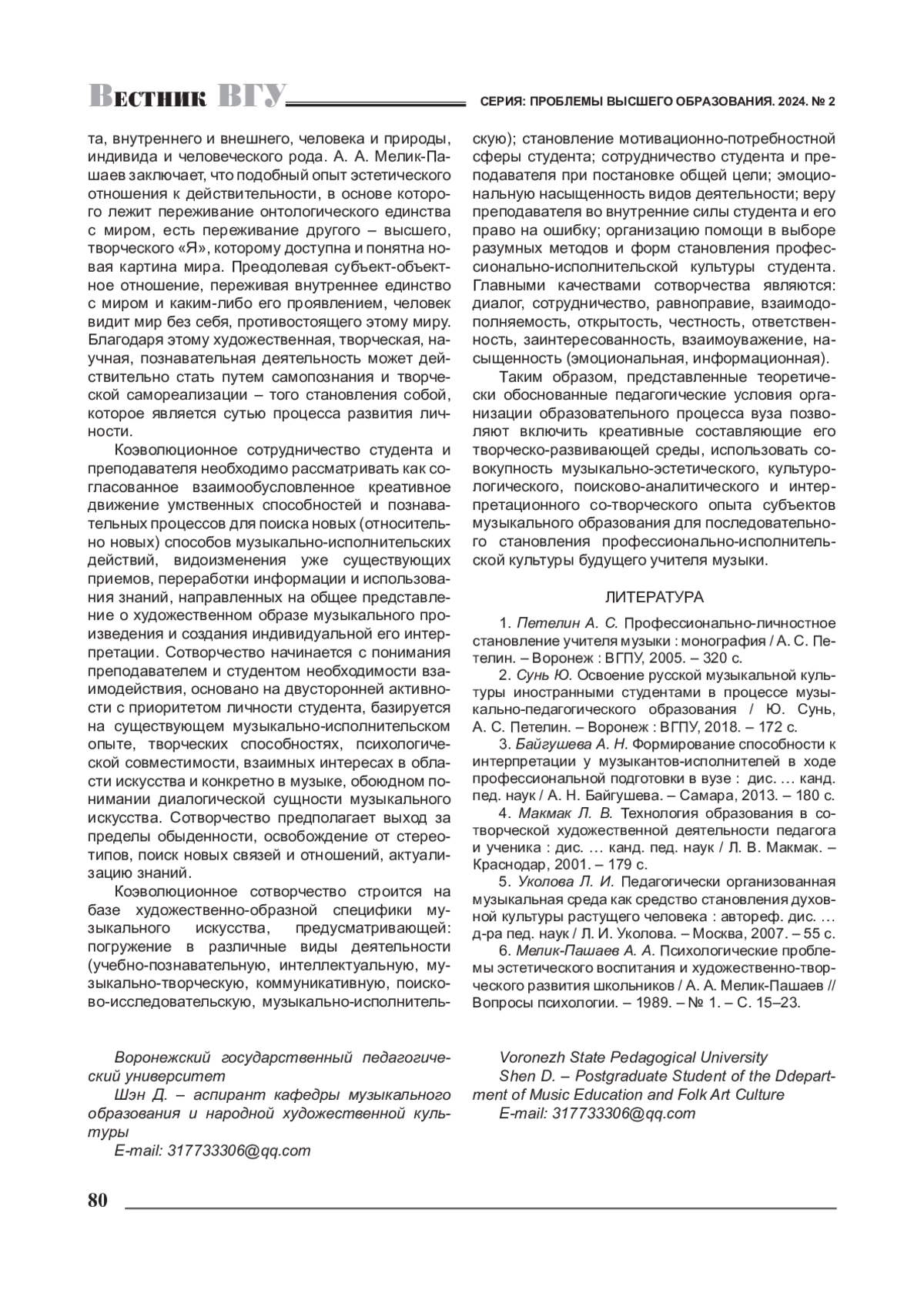 2. Сунь Ю. Освоение русской музыкальной культуры иностранными студентами в процессе музыкально-педагогического образования / Ю. Сунь, А. С. Петелин. - Воронеж: ВГПУ, 2018. - 172 с.