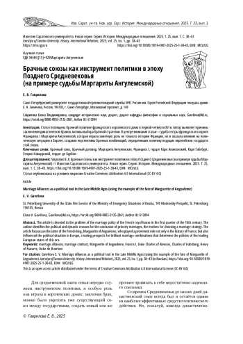 Статья посвящена брачной политике французского королевского дома в первой четверти XVI в. Автор выявляет причины заключения династических браков, мотивы выбора брачной стратегии. В центре внимания статьи – судьба сестры французского короля Франциска I Маргариты Ангулемской, которая играла заметную роль не только в истории Франции, но и оказала влияние на политическую ситуацию в Европе, создавая перспективы брачных комбинаций, определявших политику ведущих европейских государств этой эпохи.