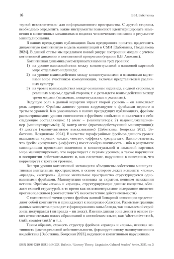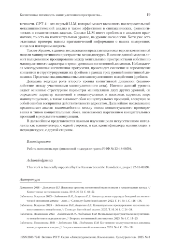 5. Заботкина, Позднякова 2024 - Заботкина В.И., Позднякова Е.М. Когнитивно-коммуникативная динамика манипулирования в медиа // Вопросы когнитивной лингвистики. 2024. № 4. С. 124-134.