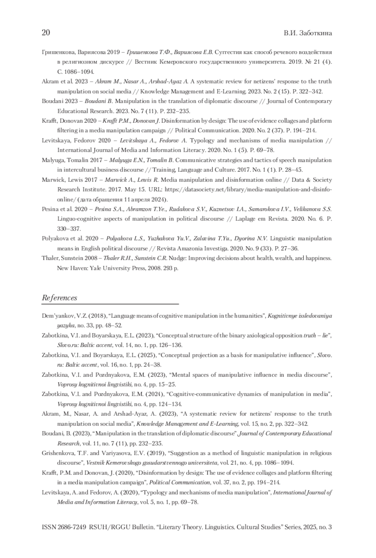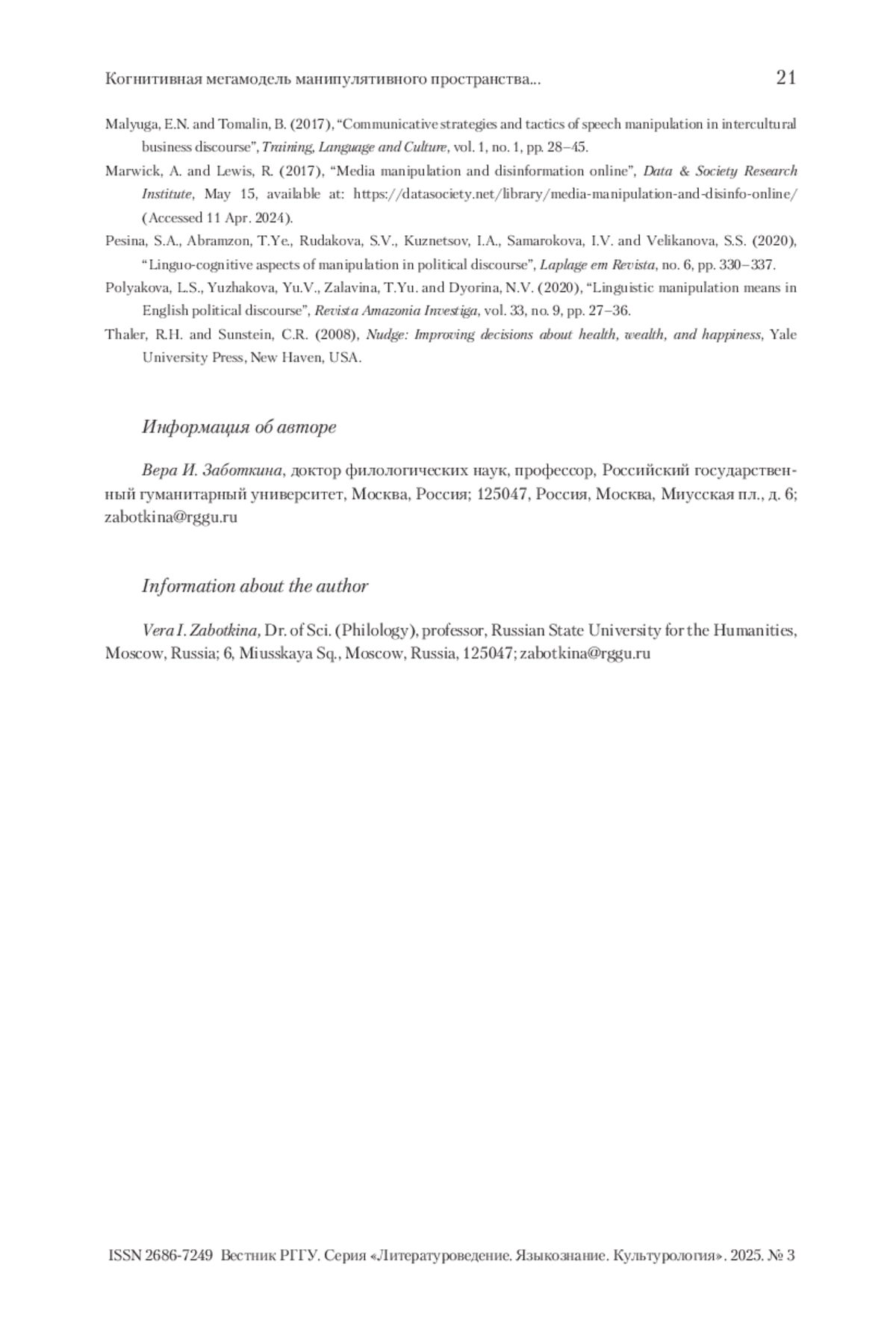 3. Заботкина, Боярская 2025 - Заботкина В.И., Боярская Е.Л. Концептуальное проецирование как основа манипулятивного воздействия // Слово.ру: балтийский акцент. 2025. Т. 16. № 1. С. 24-38.