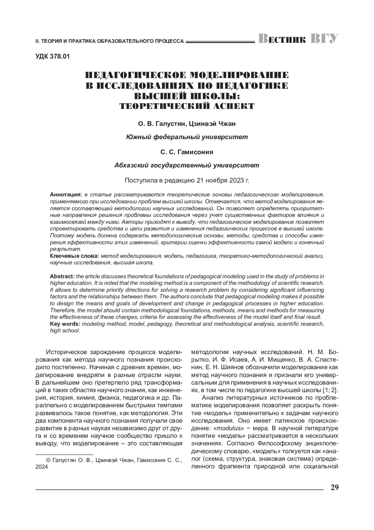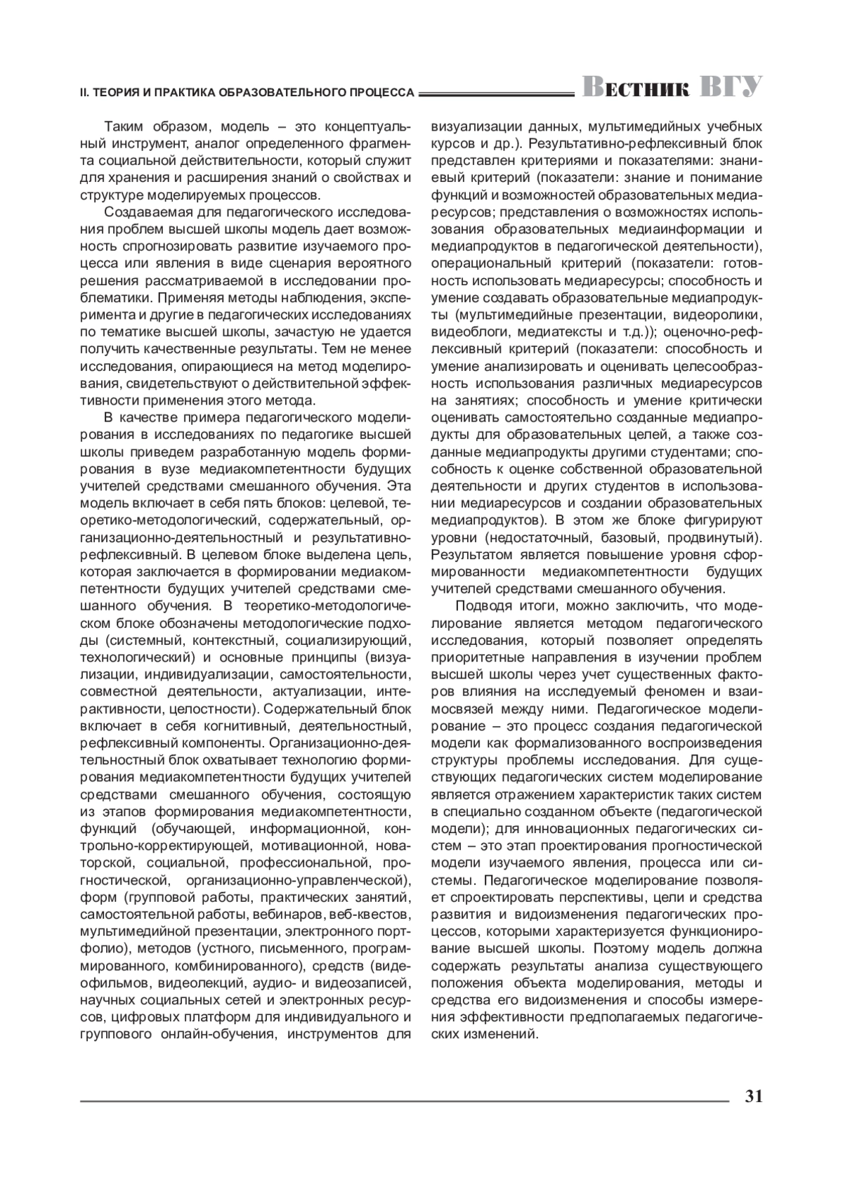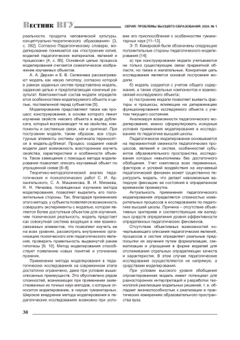 Создаваемая для педагогического исследования проблем высшей школы модель дает возможность спрогнозировать развитие изучаемого процесса или явления в виде сценария вероятного решения рассматриваемой в исследовании проблематики. Применяя методы наблюдения, эксперимента и другие в педагогических исследованиях по тематике высшей школы, зачастую не удается получить качественные результаты. Тем не менее исследования, опирающиеся на метод моделирования, свидетельствуют о действительной эффективности применения этого метода.