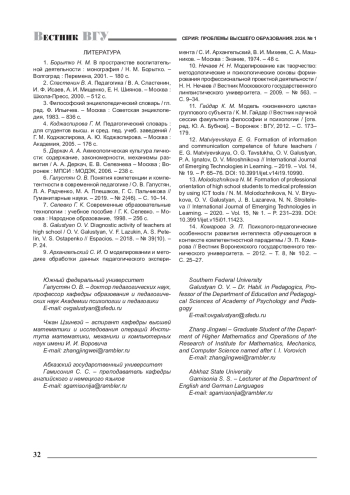 13. Molodozhnikova N. M. Formation of professional orientation of high school students to medical profession by using ICT tools / N. M. Molodozhnikova, N. V. Biryukova, O. V. Galustyan, J. B. Lazareva, N. N. Stroiteleva // International Journal of Emerging Technologies in Learning. - 2020. - Vol. 15, № 1. - P. 231-239. DOI: 10.3991/ijet.v15i01.11423 EDN: OAZMNV