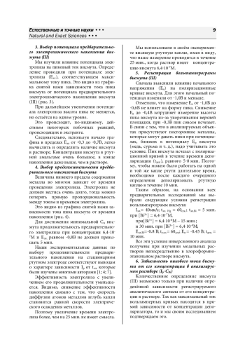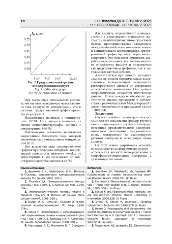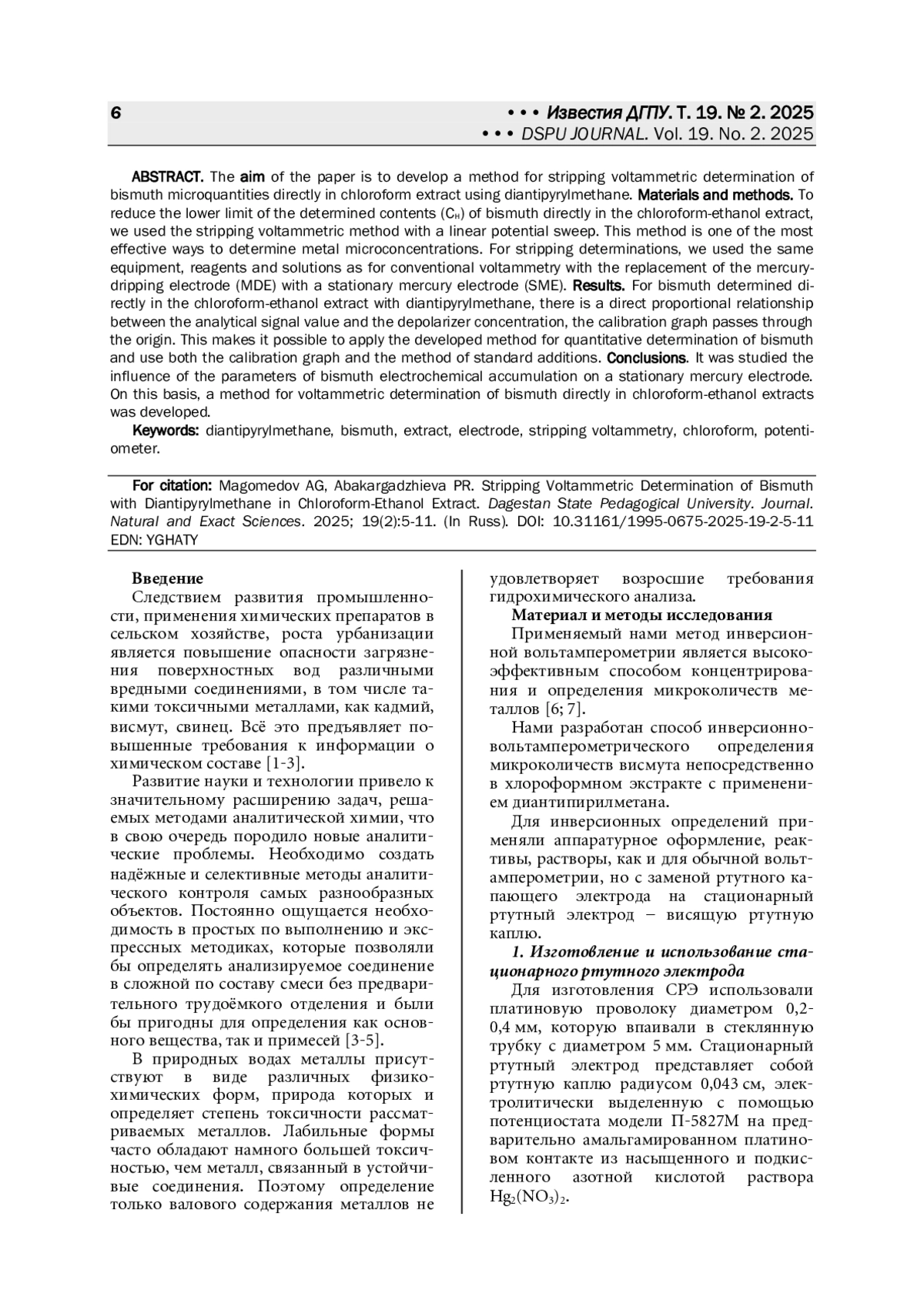 Целью работы является разработка способа инверсионно-вольтамперометрического определения микроколичеств висмута непосредственно в хлороформном экстракте с применением диантипирилметана. Материалы и методы. Для понижения нижней границы определяемых содержаний (Сн) висмута непосредственно в хлороформно-этанольном экстракте мы воспользовались инверсионно-вольтамперометрическим методом с линейной развёрткой потенциала. Этот метод является одним из наиболее эффективных способов определения микроконцентраций металла. Для инверсионных опре-делений применяли то же аппаратурное оформление, реактивы, растворы, что для обычной вольтампе-рометрии с заменой ртутно-капающего электрода (РКЭ) на стационарный ртутный электрод (СРЭ). Ре-зультаты. Для висмута, определённого непосредственно в хлороформно-этанольном экстракте с дианти-пирилметаном, существует прямая пропорциональная зависимость между величиной аналитического сигнала и концентрацией деполяризатора, градуировочный график проходит через начало координат. Это позволяет применять разработанную методику для количественного определения висмута и поль-зоваться как градуировочным графиком, так и методом стандартных добавок. Выводы. Изучено влия-ние параметров электрохимического накопления висмута на стационарном ртутном электроде. На этой основе разработана методика вольтамперометрического определения висмута непосредственно в хлороформно-этанольных экстрактах.