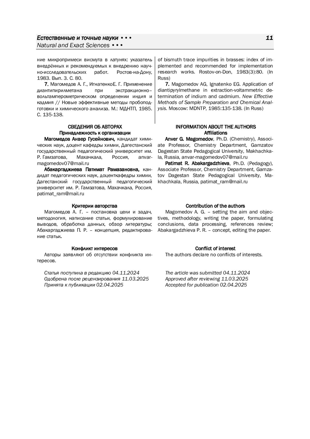 6. Магомедов А. Г., Игнатенко Е. Г. Определение микропримеси висмута в латунях: указатель внедрённых и рекомендуемых к внедрению научно-исследовательских работ. Ростов-на-Дону, 1983. Вып. 3. С. 80.