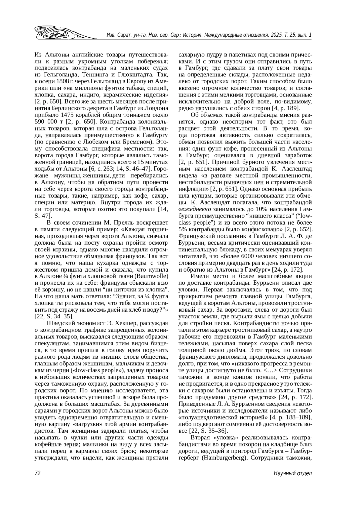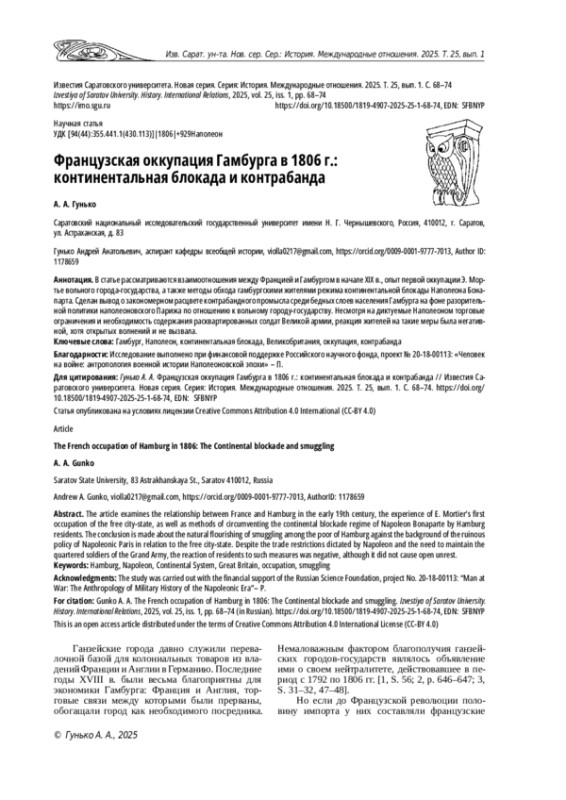 В статье рассматриваются взаимоотношения между Францией и Гамбургом в начале XIX в., опыт первой оккупации Э. Мортье вольного города-государства, а также методы обхода гамбургскими жителями режима континентальной блокады Наполеона Бонапарта. Сделан вывод о закономерном расцвете контрабандного промысла среди бедных слоев населения Гамбурга на фоне разорительной политики наполеоновского Парижа по отношению к вольному городу-государству. Несмотря на диктуемые Наполеоном торговые ограничения и необходимость содержания расквартированных солдат Великой армии, реакция жителей на такие меры была негативной, хотя открытых волнений и не вызвала.