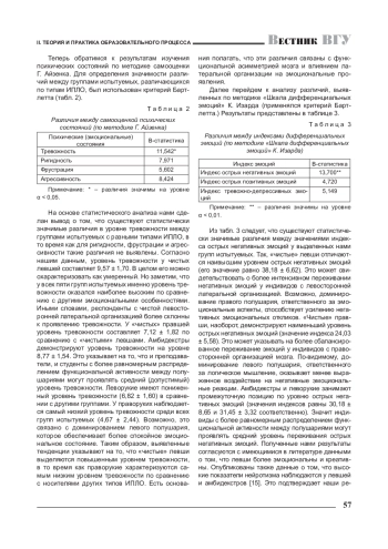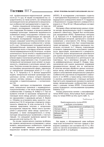 Анализ специальной литературы по теме настоящего исследования позволяет констатировать следующее. Во-первых, в процессе развития индивида происходит изменение выраженности асимметрии между полушариями головного мозга, что приводит к латерализации его функций. Последние исследования показывают, что этот процесс оказывает значительное влияние на проявление эмоциональных особенностей у человека [5 и др.]. Латерализация полушарий является фундаментальным принципом функциональной организации мозга и ключевым аспектом человеческой индивидуальности [6]. Во-вторых, на фоне значительного числа гипотез о неравнозначности функций полушарий головного мозга в осуществлении нервно-психической деятельности в науке утвердились представления о том, что различия в латеральной организации мозга влияют на выраженность, управление и регуляцию эмоций человека. Получено множество данных, указывающих на специфику эмоциональной сферы, зависящую от латеральной организации мозга [7–11 и др.]. Так, А. П. Чуприков и Е. А. Волков предложили модель латеральной мозговой организации эмоциогенных систем, согласно которой левополушарные системы связаны с гиперстеническими эмоциями, а правополушарные – с астеническими [12].