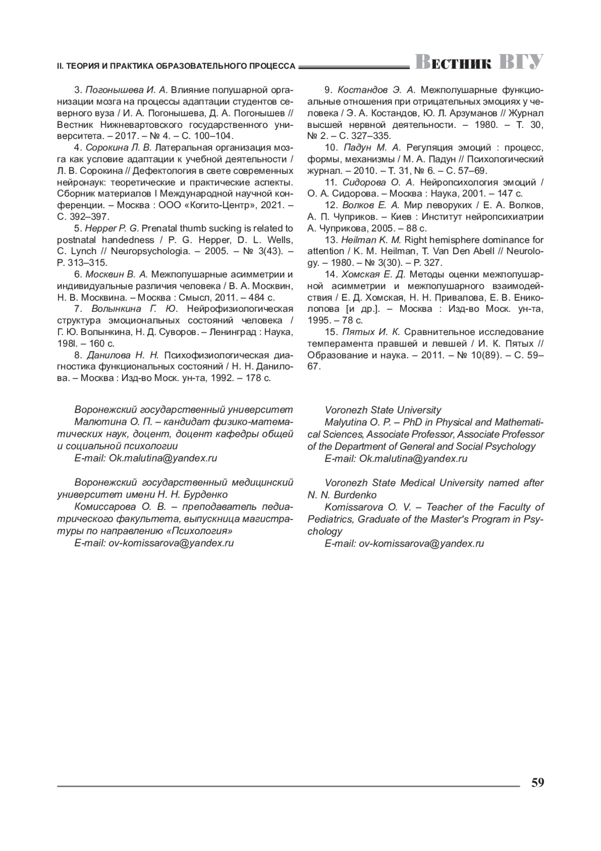 4. Сорокина Л. В. Латеральная организация мозга как условие адаптации к учебной деятельности / Л. В. Сорокина // Дефектология в свете современных нейронаук: теоретические и практические аспекты. Сборник материалов I Международной научной конференции. - Москва: ООО “Когито-Центр”, 2021. -С. 392-397. EDN: YMVINT