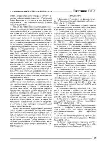 4. Мешкова И. В. Отношение современной молодежи к ненормативной лексике в контексте воспитания подрастающего поколения / И. В. Мешкова, Л. П. Завьялова // Мир науки. Педагогика и психология. - 2021. - Т. 9, № 4. - URL: https://mir-nauki.com/PDF/19PDMN421.pdf (дата обращения: 10.10.2023). EDN: GOLGUI