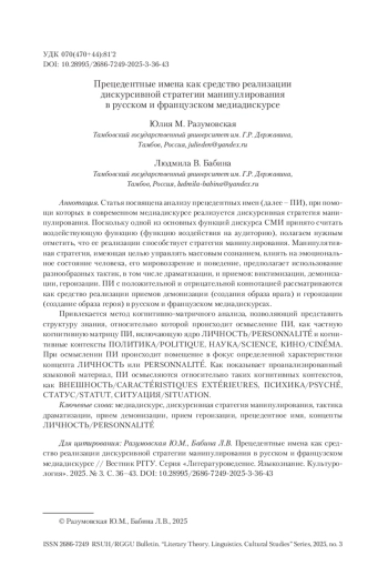 4. Разумовская, Бабина 2022 - Разумовская Ю.М., Бабина Л.В. Когнитивные основы изучения прецедентных имен (на материале русского языка) // Когнитивные исследования языка. 2022. Вып. 2 (49). С. 359-364.