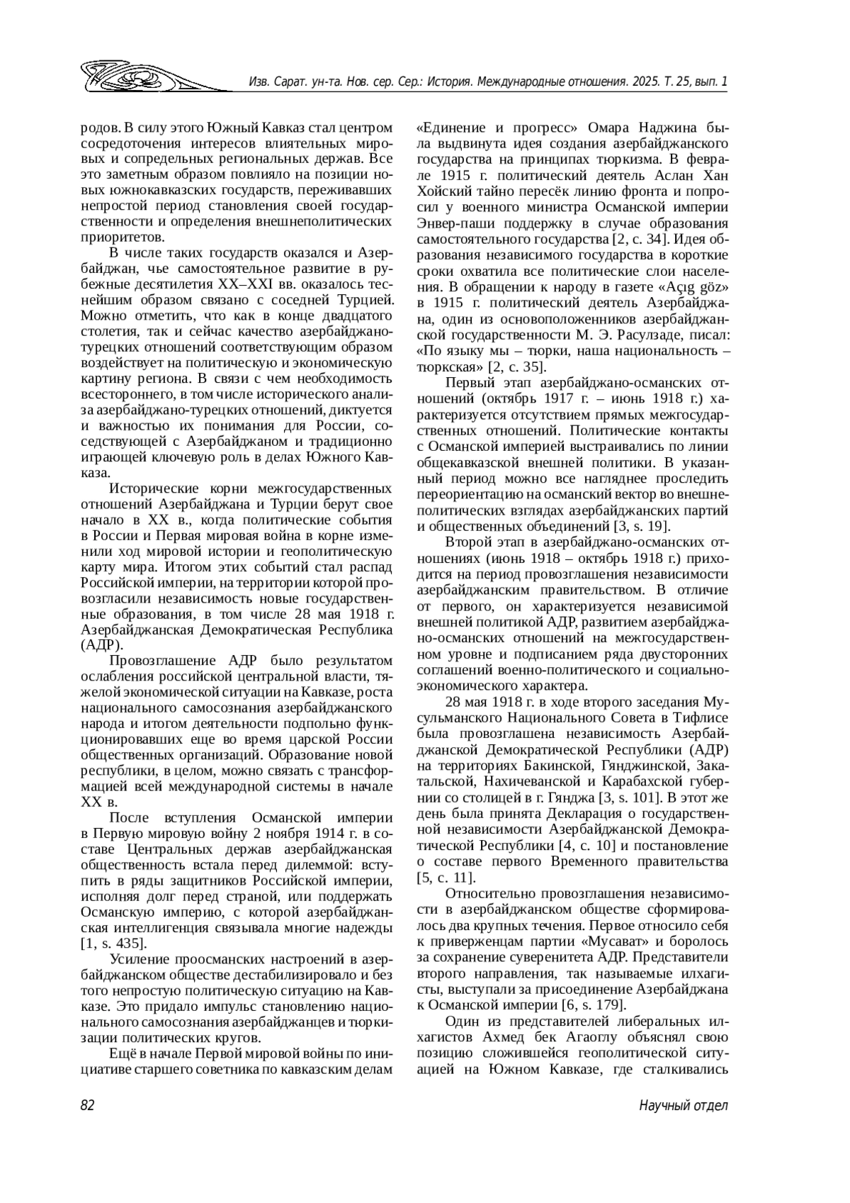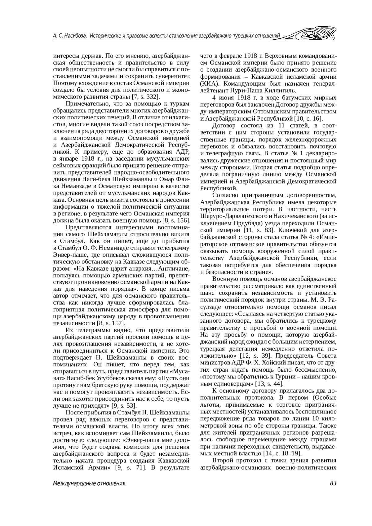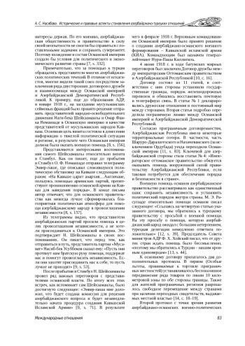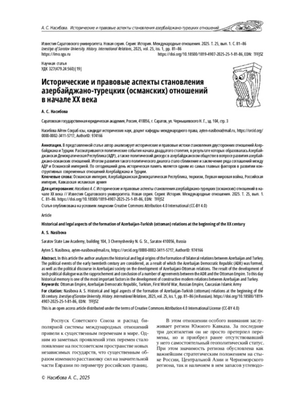 В представленной статье автор анализирует исторические и правовые истоки становления двусторонних отношений Азербайджана и Турции. Рассматриваются политические события начала двадцатого столетия, в результате которых образовалась Азербайджанская Демократическая Республика (АДР), а также политический дискурс в азербайджанском обществе в вопросе развития азербайджано-османских отношений. Итогом развития такого политического диалога стало сближение и заключение ряда соглашений между АДР и Османской империей. По сегодняшний день историческая память является одним из самых главных факторов в развитии конструктивных современных отношений Азербайджана и Турции.