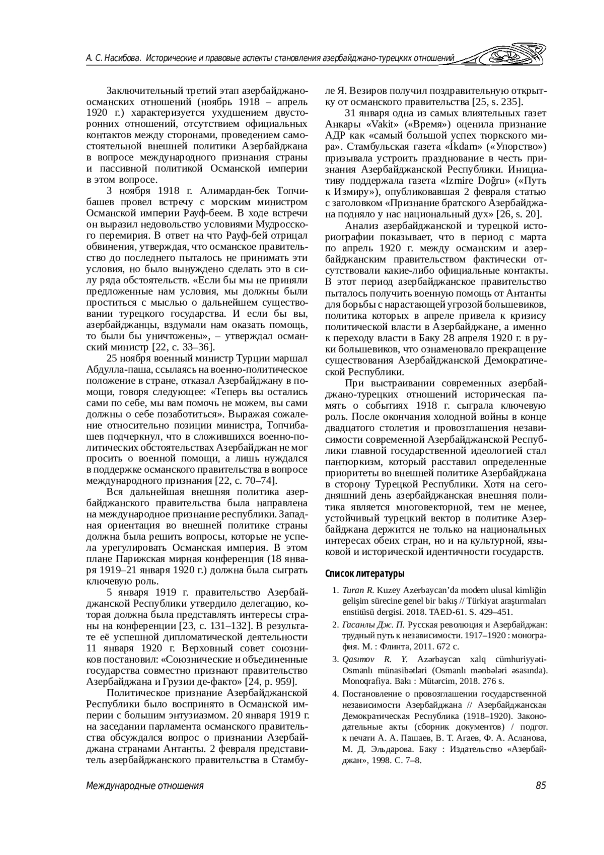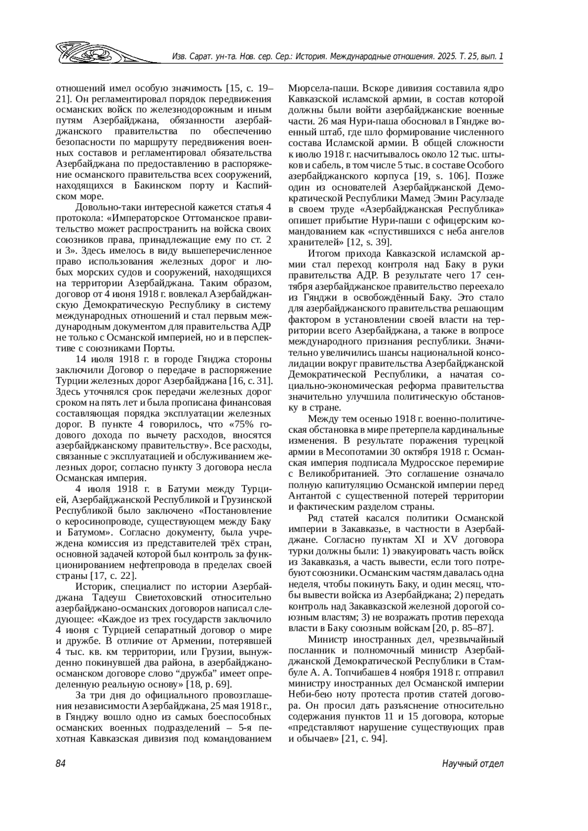 21. Письмо чрезвычайного посланника и полномочного министра Азербайджанской Республики А. А. Топчибашева министру иностранных дел Турции Наби-бею с протестом против статей договора о перемирии между Турцией и Главными Союзными и Объединившимися Державами, касающихся оккупации Баку и азербайджанских ж. д. // Азербайджанская Демократическая Республика (1918-1920). Внешняя политика (документы и материалы). Баку: Издательство “Азербайджан”, 1998. С. 93-95.
