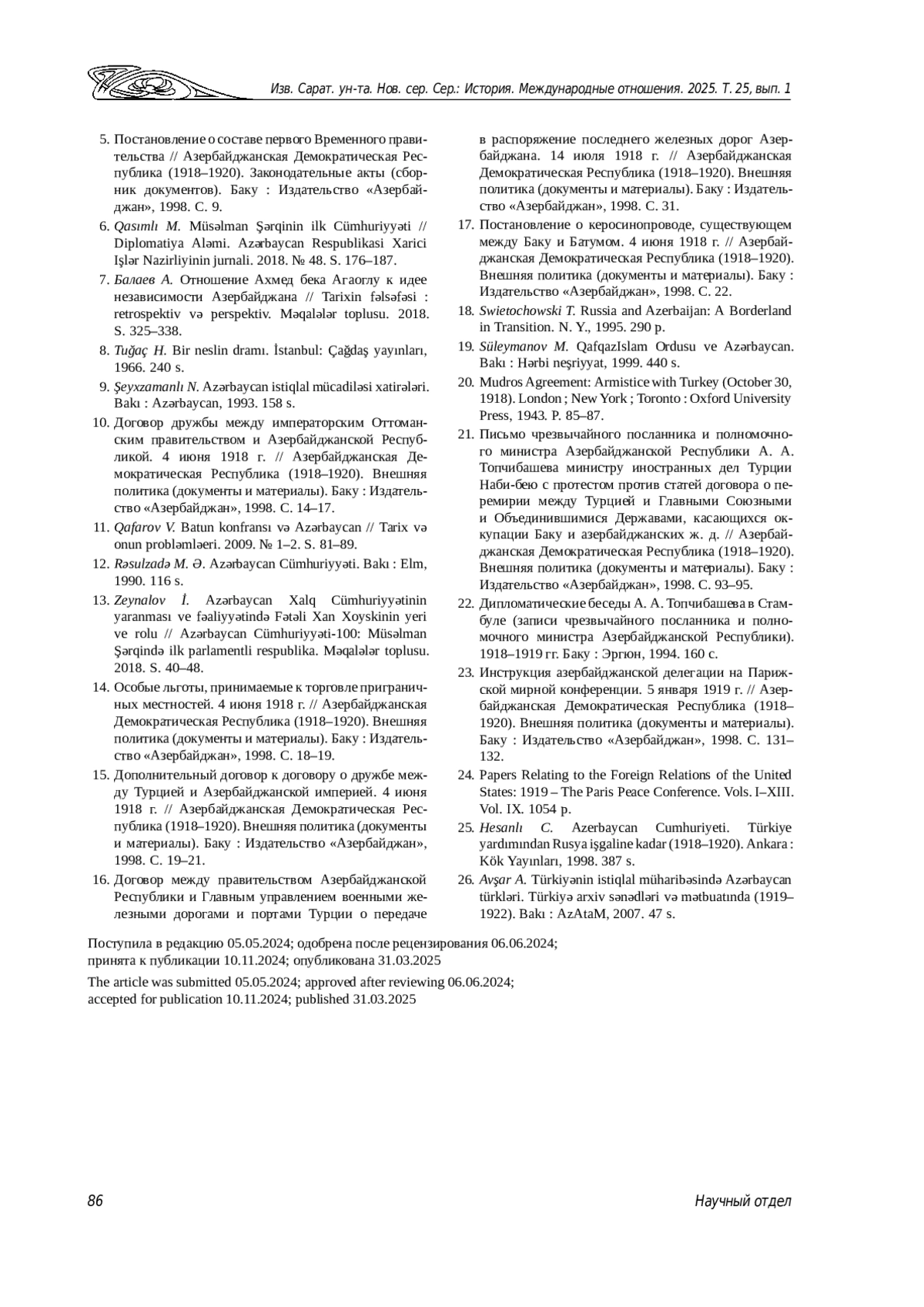 25. Hesanlı C. Azerbaycan Cumhuriyeti. Türkiye yardımından Rusya işgaline kadar (1918-1920). Ankara: Kök Yayınları, 1998. 387 s.