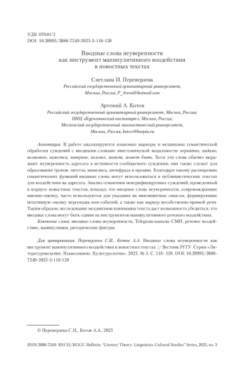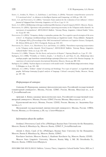 6. Переверзева и др. 2023 - Переверзева С.И., Котов А.А., Жеребцова Я.А., Зинина А.А. Вводные слова и выражения со значением (не)уверенности в Telegram-каналах СМИ // Вестник РГГУ. Серия «Литературоведение. Языкознание. Культурология». 2023. № 5. С. 153-185.