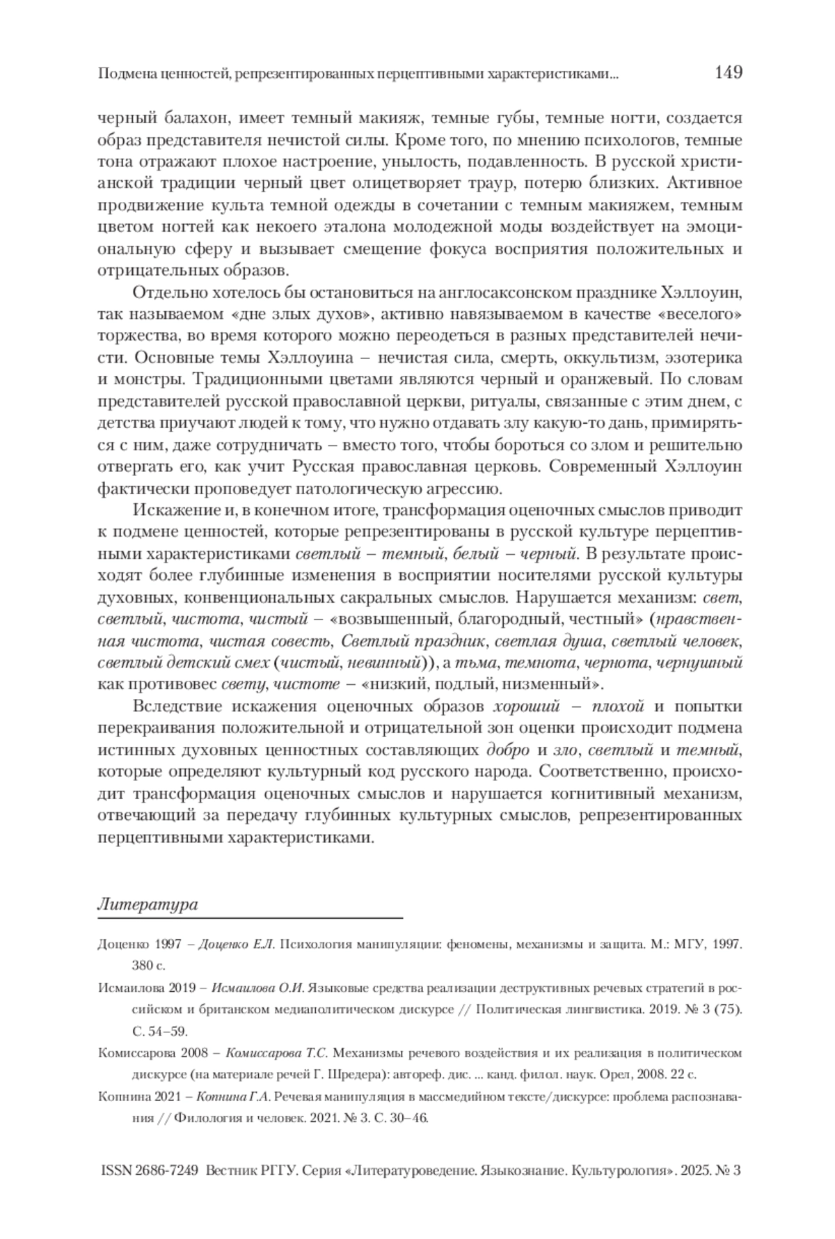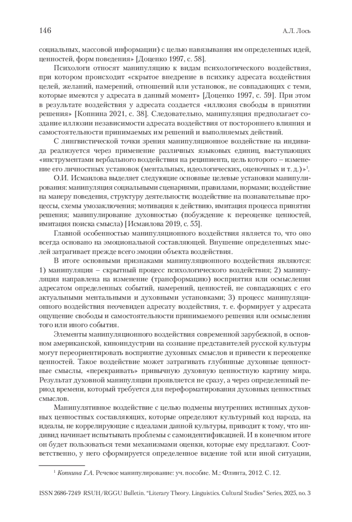 4. Копнина 2021 - Копнина Г.А. Речевая манипуляция в массмедийном тексте/дискурсе: проблема распознавания // Филология и человек. 2021. № 3. С. 30-46.