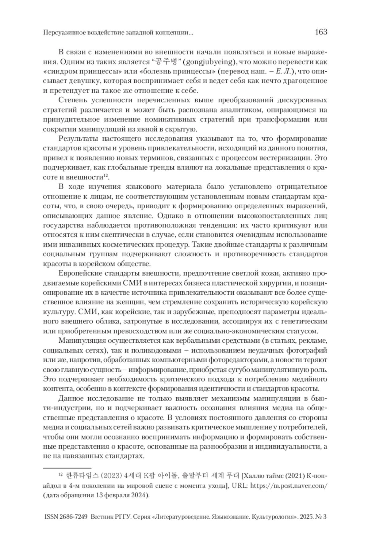В статье представлены результаты исследования средств манипуляции в корейских СМИ в сфере бьюти-индустрии, а именно формирование новых стандартов красоты. В условиях глобализации и активного влияния зарубежных медиа корейские СМИ играют ключевую роль в создании и распространении образов, соответствующих современным требованиям красоты. Выделяются наиболее значимые маркеры данных трансформаций, выявляются вербальные элементы давления внешних европейских стандартов на создаваемый образ. Эти элементы отражаются в языке и визуальных образах, используемых в медиа, что подчеркивает влияние западной культуры на корейское общество. Изучено влияние зарубежных СМИ на корейское общество средствами новостных сообщений в социальных сетях и использование неологизмов, возникающих путем заимствования; выявлены изменения в употреблении лексики; проанализированы тенденции в медиадискурсе в сфере бьюти-индустрии. Также изучено, как социальные сети становятся платформой для распространения новых стандартов и идеалов, а также для формирования общественного мнения. Результаты показывают, как различные корейские СМИ, взаимодействуя, манипулируют сферой бьюти-процедур, формируя общественное мнение и отражая реальные социальные проблемы в Южной Корее. Исследование открывает новые горизонты для понимания взаимосвязи между медиа, культурой и обществом, а также подчеркивает важность критического подхода к потреблению медийного контента в контексте формирования идентичности и стандартов красоты.