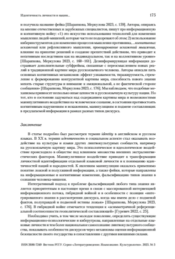 Социолингвистический и когнитивный конструкт национальной принадлежности на материале мультимедийного дискурса на английском и тем более на русском языках подвергается жесткому давлению и противостоянию на основе намеренно ложной информации, подмены одних понятий другими, полуправдивой информации и фейков, касающихся как исторического прошлого, так и настоящих событий, представленных в коммуникации. В работе представлены элементы подобного конструкта и обозначены приоритетные позиции сочетаемости в двух языках, а также комментируется диаграмма встречаемости слова идентичность в ХХ и ХХI вв. Формирование «асимметричной референциональной соотнесенности» происходит в рамках гибридности информационной войны и происходящих событий, направленных на русскоязычную культуру и человеческое сознание.