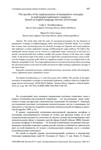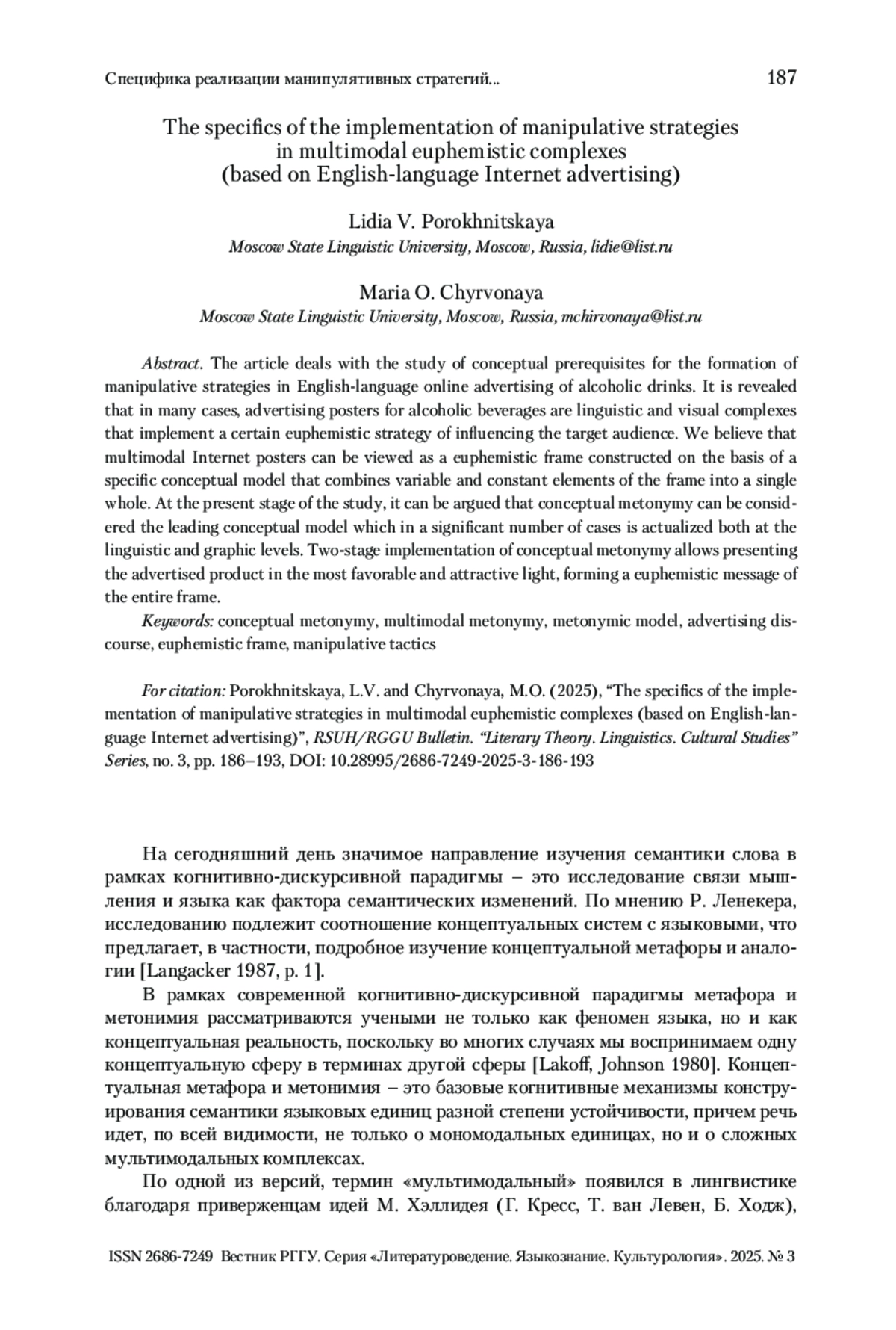 Статья посвящена изучению концептуальных предпосылок формирования манипулятивных стратегий в англоязычной интернет-рекламе спиртных напитков. Показано, что во многих случаях рекламные постеры алкогольной продукции представляют собой сложные лингвовизуальные комплексы, реализующие определенную эвфемистическую стратегию воздействия на целевую аудиторию. Мы полагаем, что мультимодальные интернет-постеры можно рассматривать как эвфемистический фрейм, конструируемый на основе концептуальной модели, которая объединяет переменные и константные элементы фрейма в единое целое. На настоящем этапе исследования можно утверждать, что ведущей концептуальной моделью следует признать концептуальную метонимию, которая в большинстве случаев актуализируется как на языковом, так и на графическом уровнях. Двухступенчатая реализация концептуальной метонимии позволяет представить рекламируемую продукции в максимально выгодном и привлекательном свете, формируя эвфемистический месседж всего фрейма.