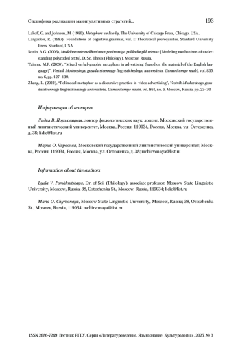 6. Чжан 2022 - Чжан Л. Полимодальная метафора как дискурсивная практика в видеорекламе // Вестник Московского государственного лингвистического университета. Гуманитарные науки. 2022. № 6 (861). С. 23-30.