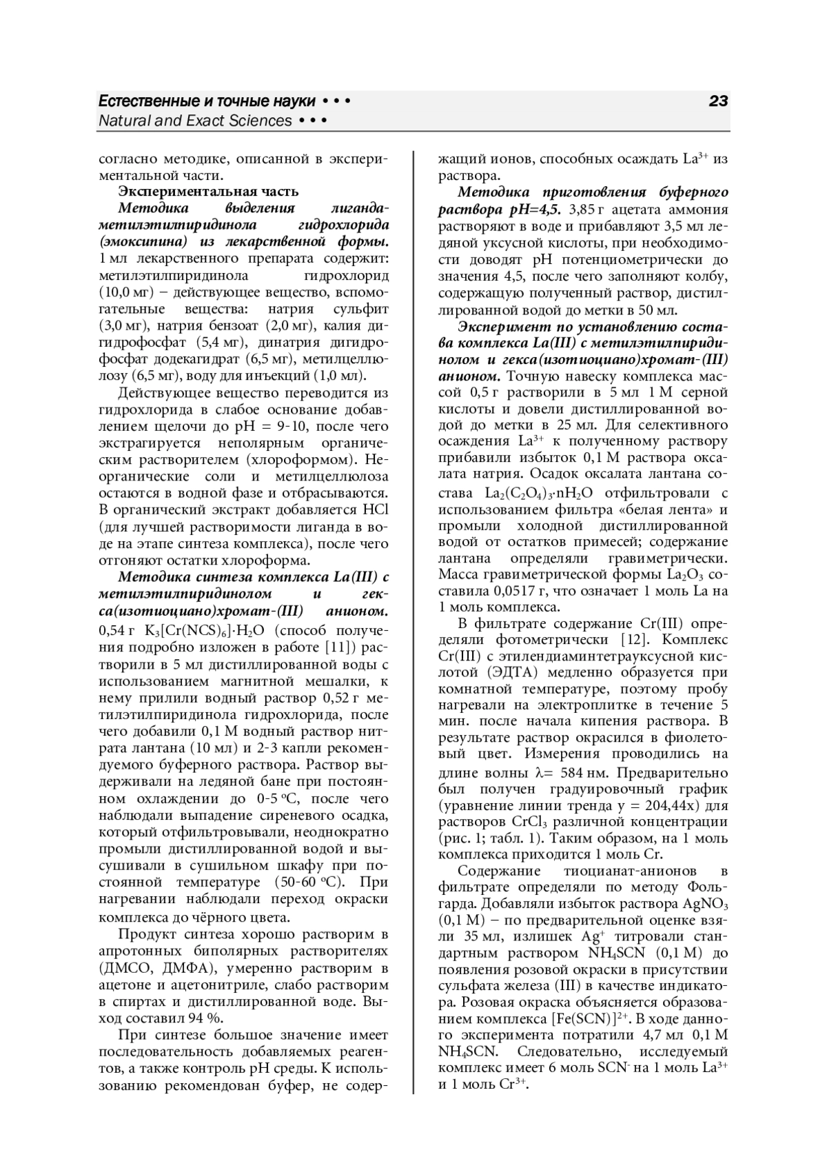 Цель работы - синтез, определение состава и прогнозирование констант стабильности комплекса La(III) с метилэтилпиридинолом и гекса(изотиоциано)хромат-(III) анионом. Методы исследования - инфракрасная, электронная спектроскопия, термический анализ, титриметрия, гравиметрия в сочетании с квантово-химическими расчетами MOPAC 2016 (UHF // PM7), ORCA v. 5.0.2 (DFT B3LYP // Sapporo TZP-2012, Sapporo-DKH3-TZP-2012). Результаты. Был установлен состав комплекса [La(MEP)₃(H₂O)₂][Cr(NCS)₆]·3H₂O.; координация La(III) происходит через гидроксильный атом кислорода лиганда, и наличие инертного аниона [Cr(NCS)₆]3⁻ было подтверждено спектроскопически. Экспериментальная константа стабильности была определена как lg β = 14,5, в то время как теоретическое моделирование показало сильную зависимость стабильности от природы донорных групп: карбоксилаты заметно повышают стабильность, тогда как объемные заместители снижают ее. Выводы. Полученные данные демонстрируют, что выбор лиганда сильно влияет на термодинамическую стабильность двойных комплексных солей, что важно для их применения в качестве термохромных индикаторов и потенциальных каталитических систем.