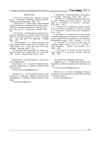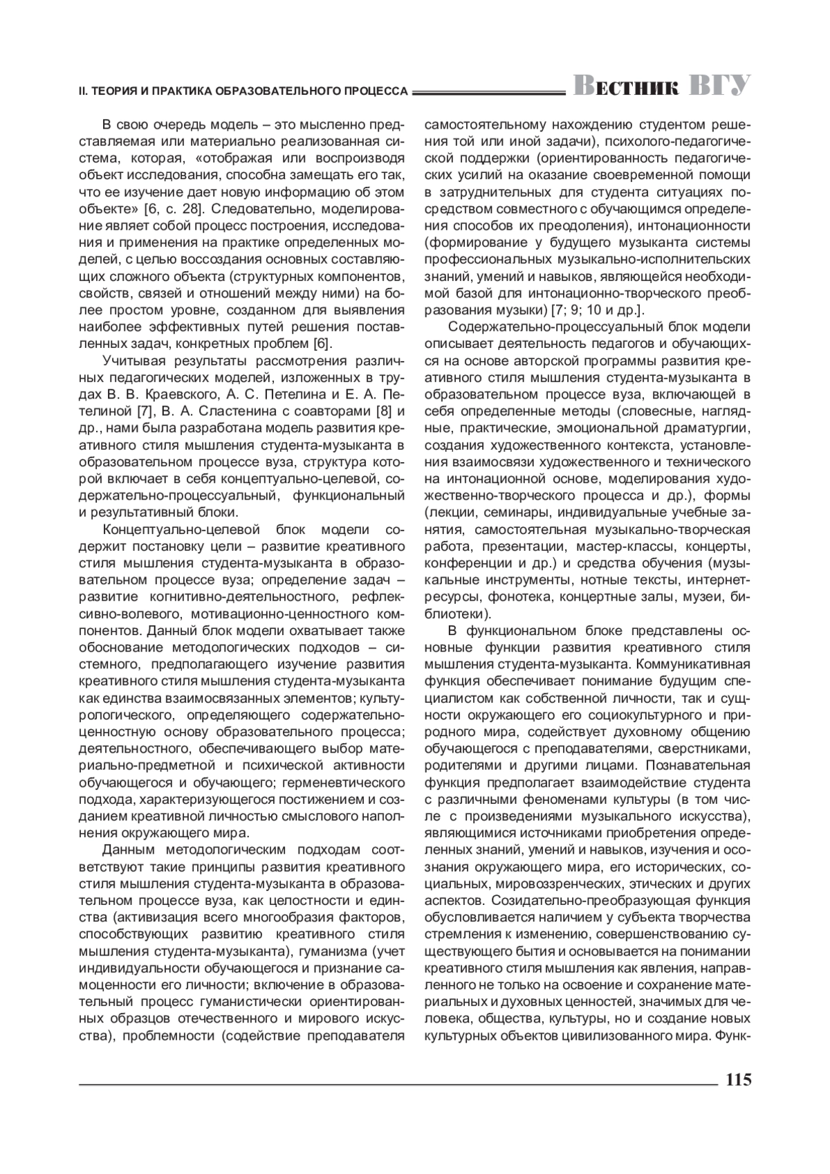 ЦЫГАНКОВА А. В., ПЕТЕЛИН А. С. МОДЕЛЬ РАЗВИТИЯ КРЕАТИВНОГО СТИЛЯ МЫШЛЕНИЯ СТУДЕНТА-МУЗЫКАНТА В ОБРАЗОВАТЕЛЬНОМ ПРОЦЕССЕ ВУЗА // ВЕСТНИК ВОРОНЕЖСКОГО ГОСУДАРСТВЕННОГО УНИВЕРСИТЕТА. СЕРИЯ: ПРОБЛЕМЫ ВЫСШЕГО ОБРАЗОВАНИЯ. 2024. № 1