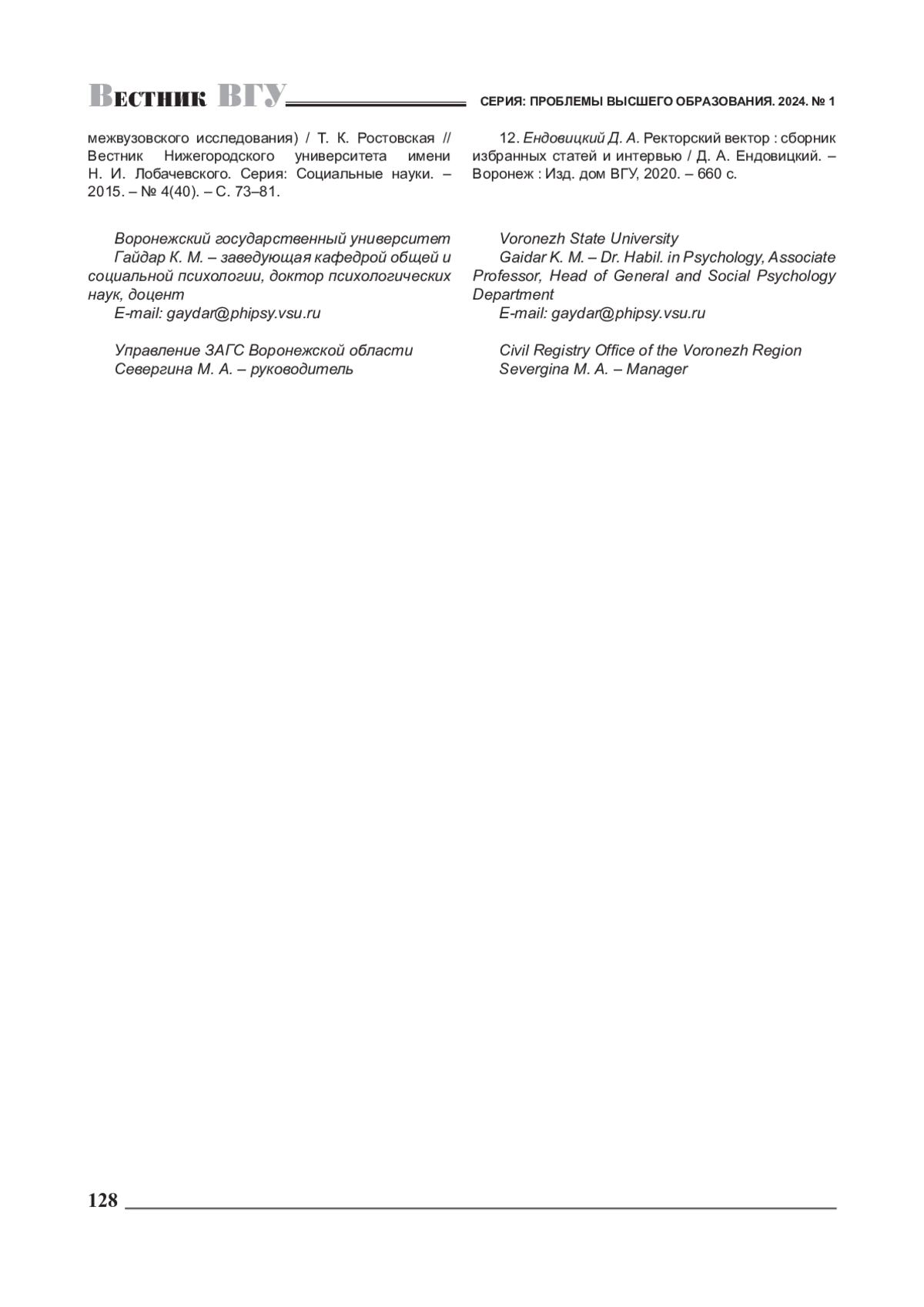 12. Ендовицкий Д. А. Ректорский вектор: сборник избранных статей и интервью / Д. А. Ендовицкий. -Воронеж: Изд. дом ВГУ, 2020. - 660 с. EDN: TJWRCC