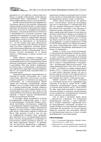 Ключевые фразы: регионализация, международная интеграция, глобализация, мировой порядок, региональный конфликт