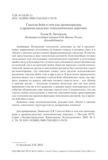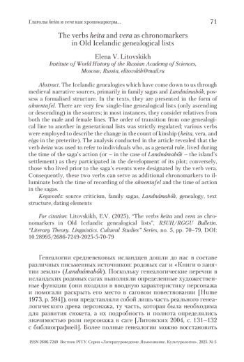 Исландские генеалогии, дошедшие до нас в средневековых нарративных источниках (в первую очередь в родовых сагах и в «Книге о занятии земли») имеют формализованную структуру. В текстах они представлены в виде поколенных росписей. Однолинейных (только нисходящих или восходящих) генеалогических перечней в источниках крайне мало, в большинстве случаев в них учитываются родственники как по мужской, так и по женской линии. Порядок перехода с одной генеалогической линии на другую в поколенных росписях был достаточно строго регламентирован, для описания смены счета родства использовались различные глаголы (heita, vera и eiga в pret.). В результате проведенного анализа видно, что с помощью глагола heita обозначались люди, как правило, жившие на момент действия сагового сюжета (или – для «Книги о занятии земли» – заселения острова), поскольку они так или иначе принимали участие в его развитии; а жившие ранее описываемых в саге событий обозначались при помощи глагола vera. Следовательно, эти два глагола можно использовать в качестве дополнительных хрономаркеров для уточнения как времени фиксации поколенных росписей, так и времени действия в сагах.