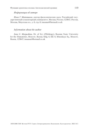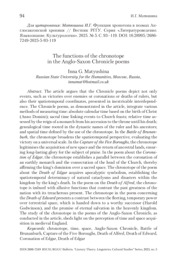 В статье аргументируется предположение, что в поэтических вставках в Англосаксонскую хронику сочетаются различные способы изображения времени: абсолютное календарное время от Рождества Христова (Anno Domini); сакральное время, заданное церковными праздниками; относительное время, измеряемое правлением монарха от восшествия на престол до кончины; генеалогическое время, основанное на династических именованиях правителя и представителей его рода; пространственное время, определяемое хронотопом. Хронотоп выполняет композиционную функцию во всех поэмах Хроники: в «Битве при Брунанбурге» акцент на хронотопе позволяет расширить пространственно-временную перспективу и оценить значимость победы в масштабах вселенной; в «Завоевании пяти бургов» с помощью хронотопа легитимизируется освоение нового пространства и возвращение исконных земель; в поэтической вставке о коронации Эдгара Миролюбивого восшествие на трон земного монарха уподобляется благодаря хронотопу посвящению в чин духовного лица. Хронотоп поэмы о кончине Эдгара Миролюбивого приобретает апокалиптический символизм, устанавливая пространственно-хронологическую обусловленность природных катаклизмов и бедствий в стране кончиной короля. В поэме об убийстве Альфреда хронотоп получает аллюзивную функцию, наделяющую его ассоциациями с панегирической поэзией и позволяющую противопоставить былое величие англов их бесславному настоящему. Хронотоп в поэме о кончине Эдуарда Исповедника вводит контраст преходящей, временной власти над земным королевством и вечного спасения в мире ином. Изучение хронотопа в поэмах Англосаксонской хроники, проведенное в статье, позволяет пролить свет на восприятие времени и способы освоения пространства в средневековой Англии.