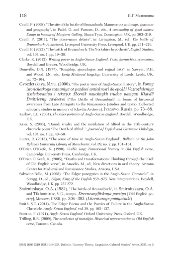 1. Гвоздецкая 2000 - Гвоздецкая Н.Ю. Поэтическое осмысление англосаксонской истории в «Битве при Брунанбурге» // Формы исторического сознания от поздней античности до эпохи Возрождения (исследования и тексты): Сб. научных трудов памяти Клавдии Дмитриевны Авдеевой. Иваново, 2000. С. 73-88.
