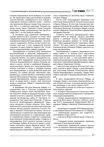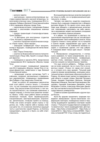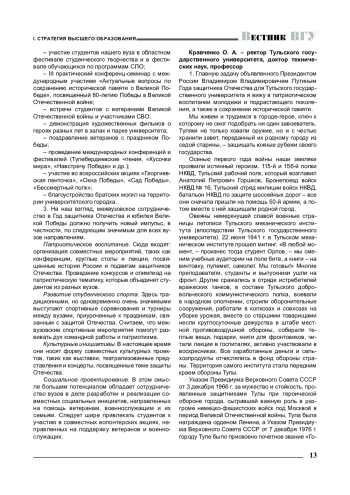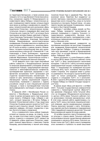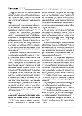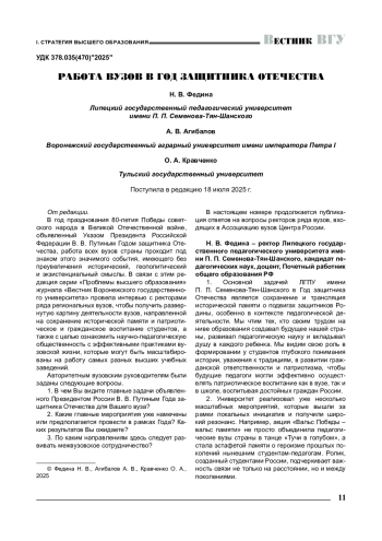 год празднования 80-летия Победы советского народа в Великой Отечественной войне, объявленный Указом Президента Российской Федерации В. В. Путиным Годом защитника Отечества, работа всех вузов страны проходит под знаком этого значимого события, имеющего без преувеличения исторический, геополитический и экзистенциальный смыслы. В связи с этим редакция серии «Проблемы высшего образования» журнала «Вестник Воронежского государственного университета» провела интервью с ректорами ряда региональных вузов, чтобы получить развернутую картину деятельности вузов, направленной на сохранение исторической памяти и патриотическое и гражданское воспитание студентов, а также с целью ознакомить научно-педагогическую общественность с эффективными практиками вузовской жизни, которые могут быть масштабированы на работу самых разных высших учебных заведений.