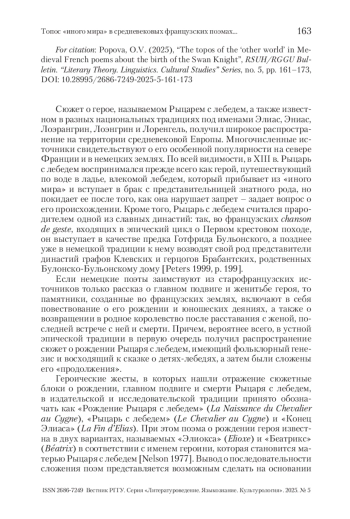 ПОПОВА О. В. ТОПОС «ИНОГО МИРА» В СРЕДНЕВЕКОВЫХ ФРАНЦУЗСКИХ ПОЭМАХ О РОЖДЕНИИ РЫЦАРЯ С ЛЕБЕДЕМ // ВЕСТНИК РГГУ. СЕРИЯ «ЛИТЕРАТУРОВЕДЕНИЕ. ЯЗЫКОЗНАНИЕ. КУЛЬТУРОЛОГИЯ». 2025. № 5