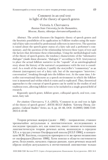 26. Черванёва 2024 - Черванёва В.А. Ремарка в сказочном и несказочном тексте: проблема речевого жанра // Фольклор: структура, типология, семиотика. 2024. Т. 7. № 2. С. 10-25.