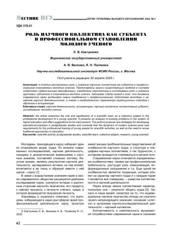 В статье рассмотрены роль и значение научного коллектива как субъекта в профессиональном становлении молодого ученого. Представлены анализ существующих проблем в системе подготовки кадров высшей квалификации, определены перспективы в исследовании роли и значения групповых субъектов в становлении молодых ученых. Авторами cделан вывод о том, что динамика современной науки выдвигает новые требования к профессиональной подготовке молодежи к занятиям научной деятельностью, а также о необходимости пересмотра традиционных подходов к обучению в аспирантуре.