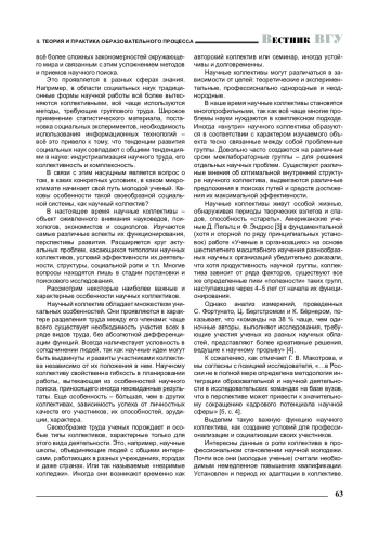 В наше время научные коллективы становятся многопрофильными, так как всё чаще многие проблемы науки нуждаются в комплексном подходе. Иногда «внутри» научного коллектива образуются в соответствии с характером изучаемого объекта тесно связанные между собой проблемные группы. Довольно часто создаются на различные сроки межлабораторные группы – для решения отдельных научных проблем. Существуют различные мнения об оптимальной внутренней структуре научного коллектива, выдвигаются различные предложения в поисках путей и средств достижения их максимальной эффективности. Научные коллективы живут особой жизнью, обнаруживая периоды творческих взлетов и спадов, способность «стареть». Американские ученые Д. Пельтц и Ф. Эндрюс [3] в фундаментальной (хотя и спорной по ряду принципиальных установок) работе «Ученые в организациях» на основе шестилетнего масштабного изучения разнообразных научных организаций убедительно доказали, что хотя продуктивность научной группы, коллектива зависит от ряда факторов, существуют все же определенные пики «полезности» таких групп, наступающие через 4–5 лет от начала их функционирования.