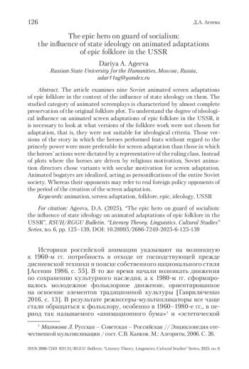 АГЕЕВА Д. А. БОГАТЫРЬ НА СТРАЖЕ СОЦИАЛИЗМА: ВЛИЯНИЕ ГОСУДАРСТВЕННОЙ ИДЕОЛОГИИ НА АНИМАЦИОННЫЕ ЭКРАНИЗАЦИИ ЭПИЧЕСКОГО ФОЛЬКЛОРА В СССР // ВЕСТНИК РГГУ. СЕРИЯ «ЛИТЕРАТУРОВЕДЕНИЕ. ЯЗЫКОЗНАНИЕ. КУЛЬТУРОЛОГИЯ». 2025. № 6