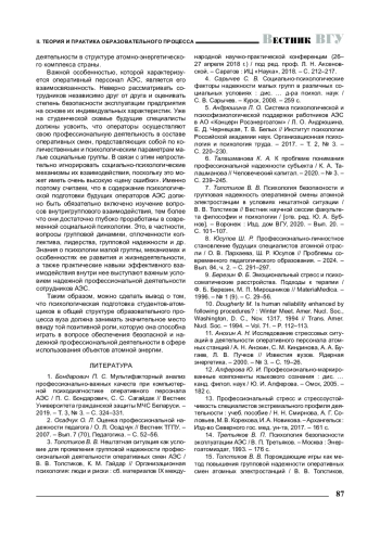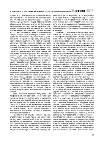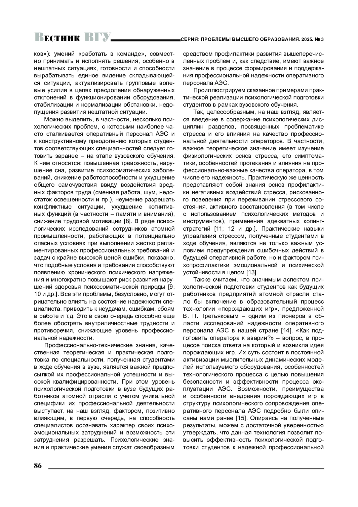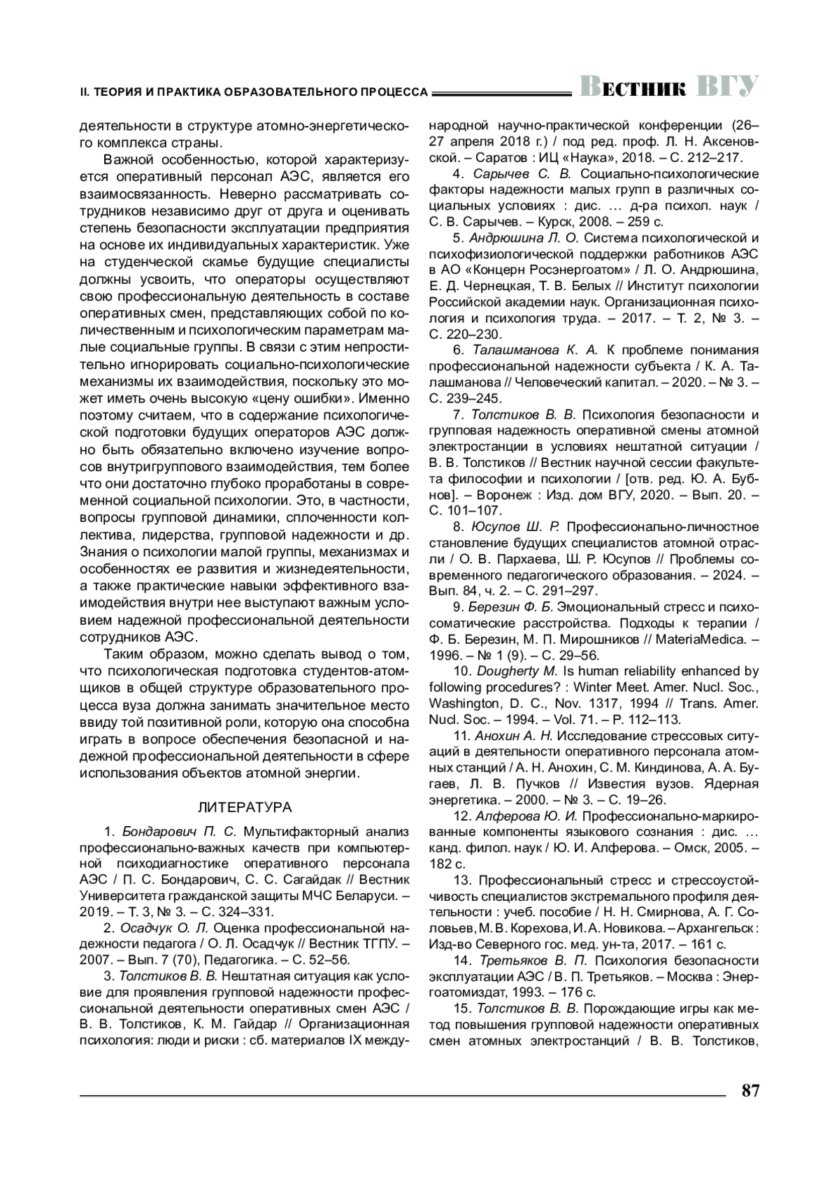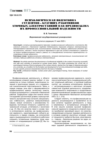 ТОЛСТИКОВ В. В. ПСИХОЛОГИЧЕСКАЯ ПОДГОТОВКА СТУДЕНТОВ - БУДУЩИХ РАБОТНИКОВ АТОМНЫХ ЭЛЕКТРОСТАНЦИЙ КАК ПРЕДПОСЫЛКА ИХ ПРОФЕССИОНАЛЬНОЙ НАДЕЖНОСТИ // ВЕСТНИК ВОРОНЕЖСКОГО ГОСУДАРСТВЕННОГО УНИВЕРСИТЕТА. СЕРИЯ: ПРОБЛЕМЫ ВЫСШЕГО ОБРАЗОВАНИЯ. 2025. № 3