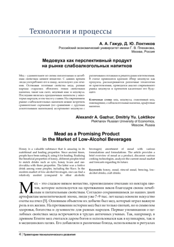 Мед – удивительное по своим питательным и целебным свойствам ценное вещество. С давних времен люди употребляют его в пищу, используют для лечения. Осознавая полезные свойства меда, разные народы старались обогатить этими свойствами напитки, такие как сыто, медовый квас и медовуха. Последняя являлась праздничным напитком у некоторых народов, в том числе у славян. На современном рынке слабоалкогольных напитков можно встретить сравнительно скромный (по сравнению с другими алкогольными напитками) ассортимент медовухи с различными составами и рецептурами изготовления. В статье приводится краткий обзор медовухи как продукта, рассматриваются различные технологии ее приготовления, проводится анализ современного рынка медовухи и прогнозов касательно его будущего.
