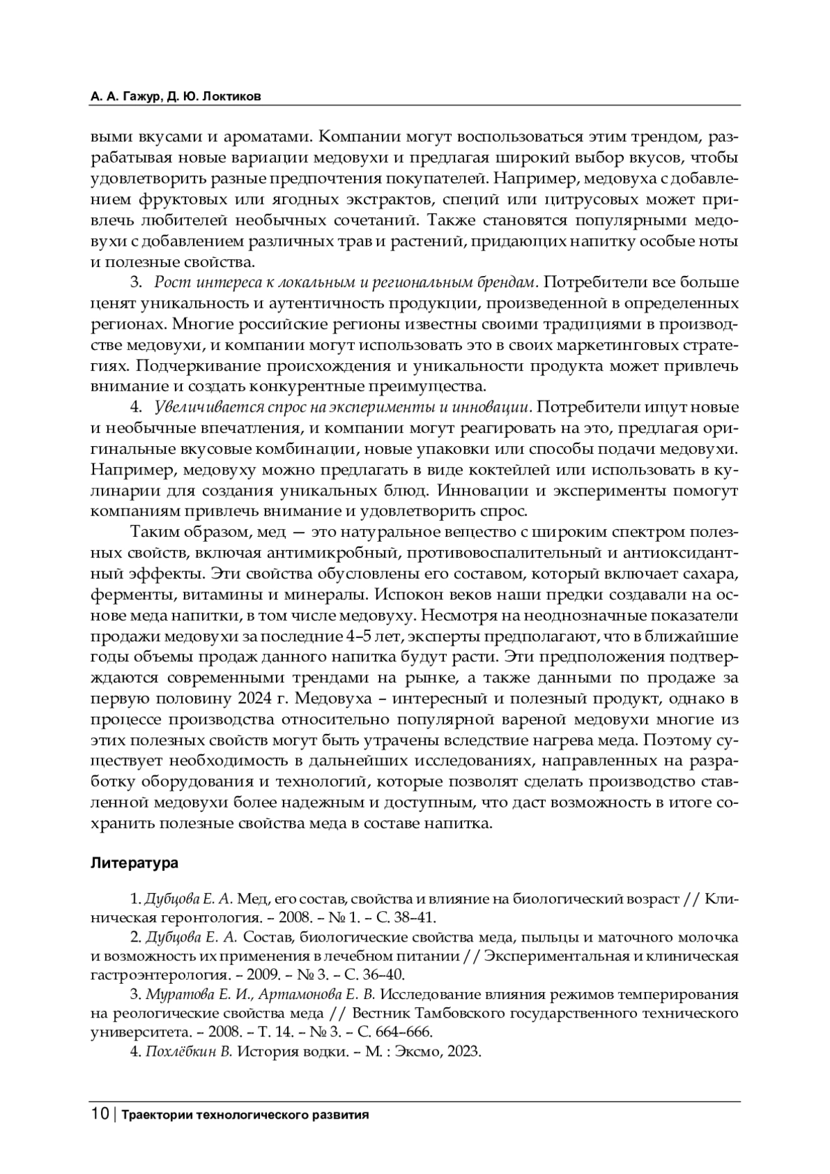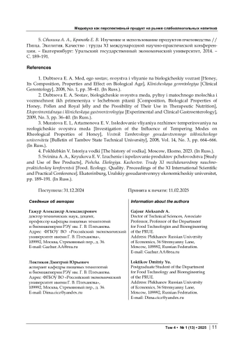 Dubtsova E. A. Med, ego sostav, svoystva i vliyanie na biologicheskiy vozrast [Honey, Its Composition, Properties and Effect on Biological Age], Klinicheskaya gerontologiya [Clinical Gerontology], 2008, No. 1, pp. 38-41. (In Russ.).