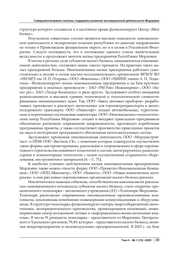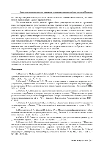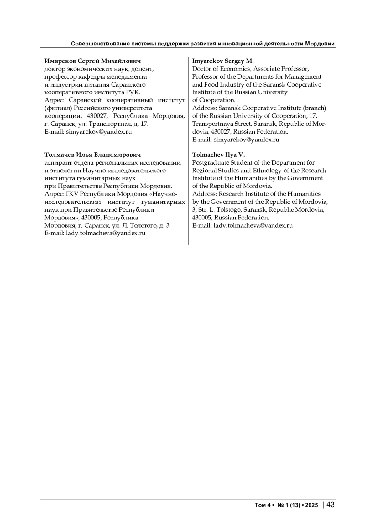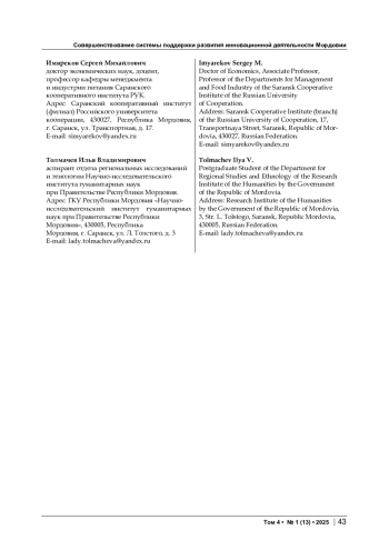 Статья: СОВЕРШЕНСТВОВАНИЕ СИСТЕМЫ ПОДДЕРЖКИ РАЗВИТИЯ ИННОВАЦИОННОЙ ДЕЯТЕЛЬНОСТИ РЕСПУБЛИКИ МОРДОВИЯ (2025)