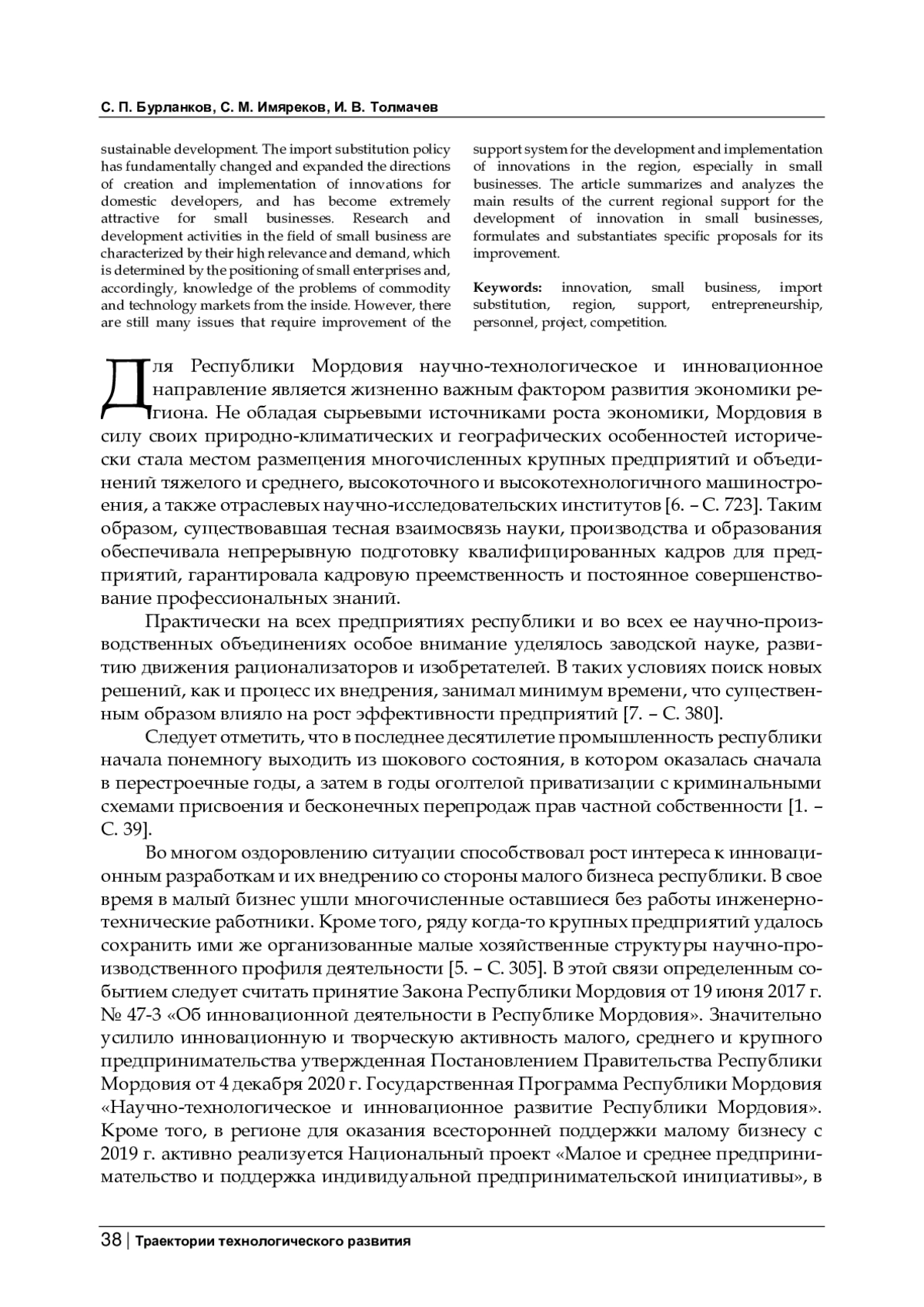 Ключевые фразы: инновации, МАЛЫЙ БИЗНЕС, ИМПОРТОЗАМЕЩЕНИЕ, РЕГИОН, ПОДДЕРЖКА, предпринимательство, кадры, проект, конкуренция
