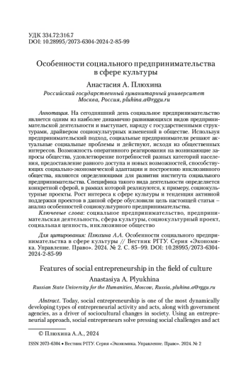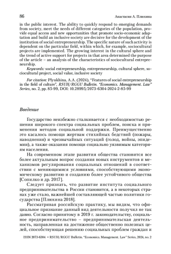 На сегодняшний день социальное предпринимательство является одним из наиболее динамично развивающихся видов предпринимательской деятельности и выступает, наряду с государственными структурами, драйвером социокультурных изменений в обществе. Используя предпринимательский подход, социальные предприниматели решают актуальные социальные проблемы и действуют, исходя из общественных интересов. Возможность оперативного реагирования на возникающие запросы общества, удовлетворение потребностей разных категорий населения, предоставление равного доступа и новых возможностей, способствующих социально-экономической адаптации и построению инклюзивного общества, являются определяющими для развития института социального предпринимательства. Специфика такого вида деятельности определяется конкретной сферой, в рамках которой реализуются, к примеру, социокультурные проекты. Рост интереса к сфере культуры и тенденция активной поддержки проектов в данной сфере обусловили цель настоящей статьи – анализ особенностей социокультурного предпринимательства.