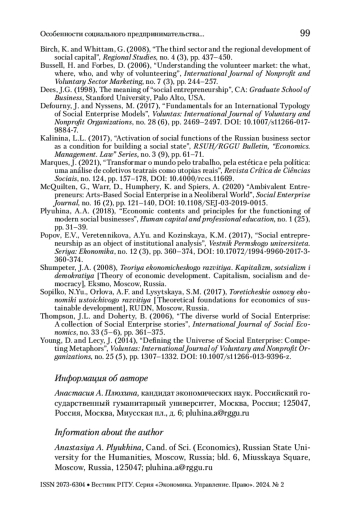 3. Попов и др. 2017 - Попов Е.В., Веретенникова А.Ю., Козинская К.М. Социальное предпринимательство как объект институционального анализа // Вестник Пермского университета. Серия: Экономика. 2017. Т. 12. № 3. С. 360-374. https://doi.org/10.17072/1994-9960-2017-3-360-374.