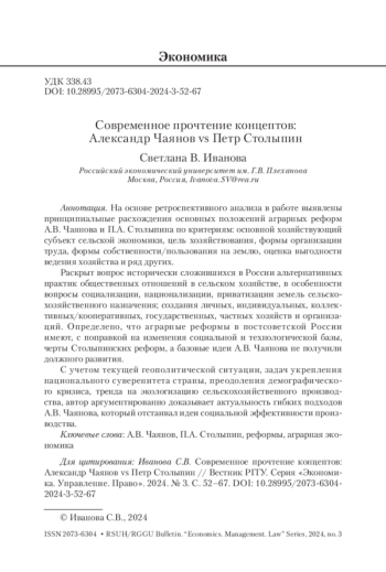 На основе ретроспективного анализа в работе выявлены принципиальные расхождения основных положений аграрных реформ А. В. Чаянова и П. А. Столыпина по критериям: основной хозяйствующий субъект сельской экономики, цель хозяйствования, формы организации труда, формы собственности/пользования на землю, оценка выгодности ведения хозяйства и ряд других.