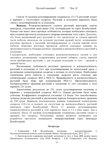 14. Дорошенко Н.П., Пузырнова В.Г. Некоторые аспекты создания коллекции генофонда винограда in vitro // Актуальные вопросы развития отраслей сельского хозяйства: теория и практика. III Всероссийская научно практическая конференция “Проблемы и перспективы биологического земледелия. Ростов-на-Дону–Таганрог: ЮФУ, 2019. С 120–127.