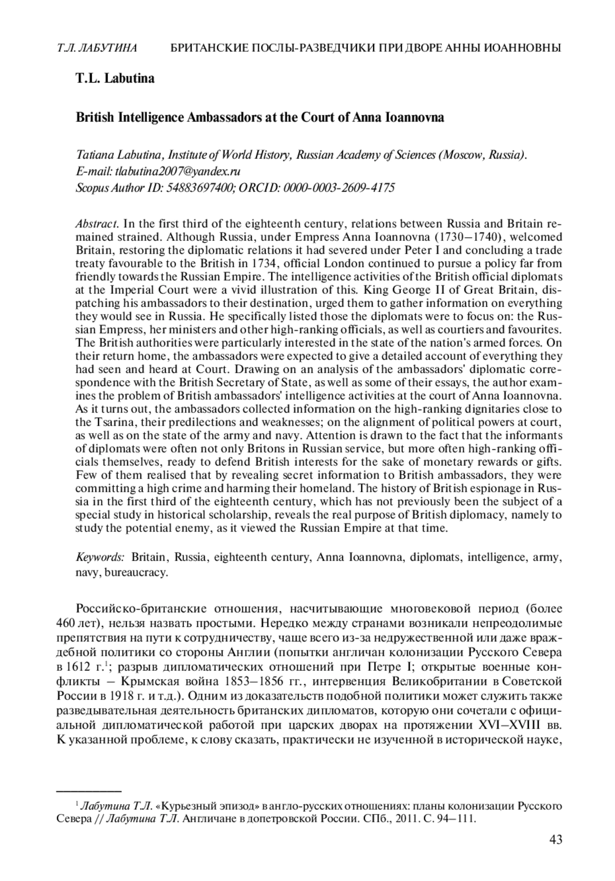 3. Лабутина Т.Л. Британские разведчики в России (XVI-XVIII вв.) // Многоликость целого: из истории цивилизаций Старого и Нового света. Сборник статей в честь Виктора Леонидовича Малькова. М., 2011. С. 389-411.